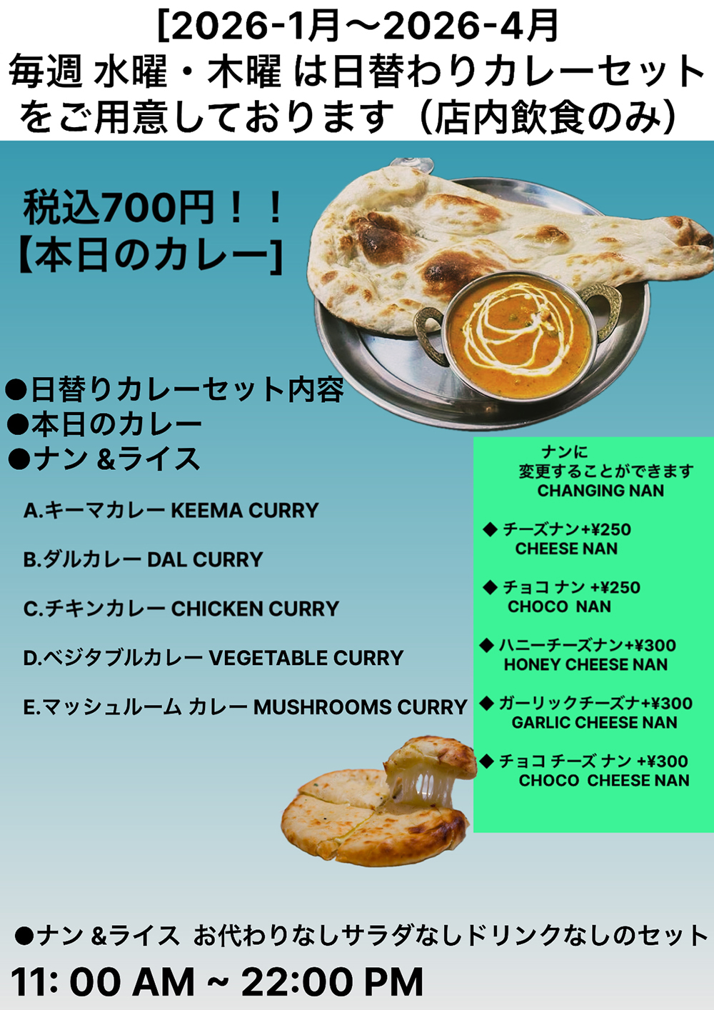 【グムティーヒル】 1月〜4月の水・木曜限定 日替わりカレーセットを700円で提供